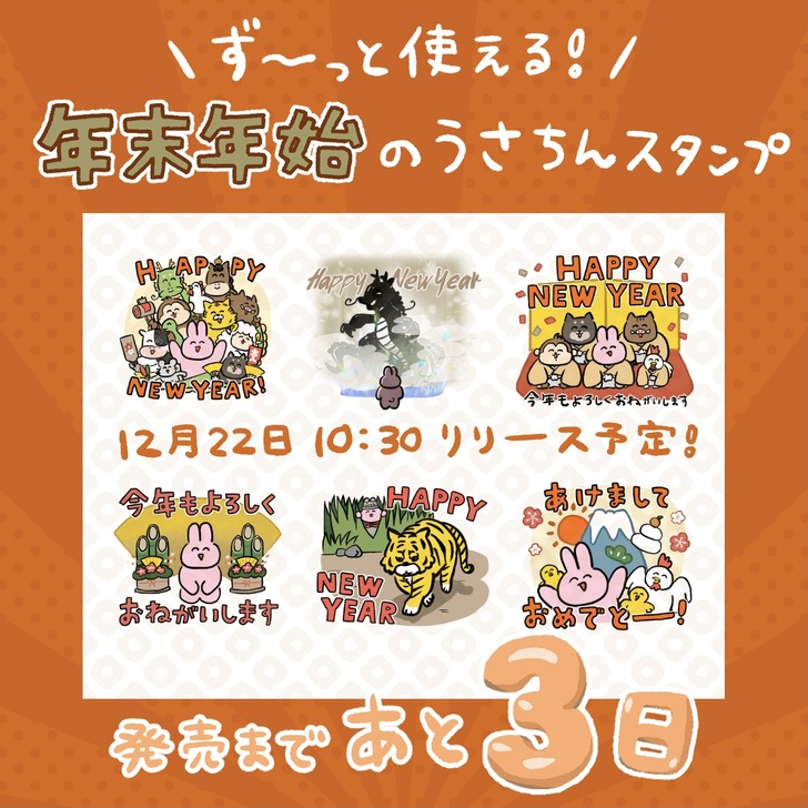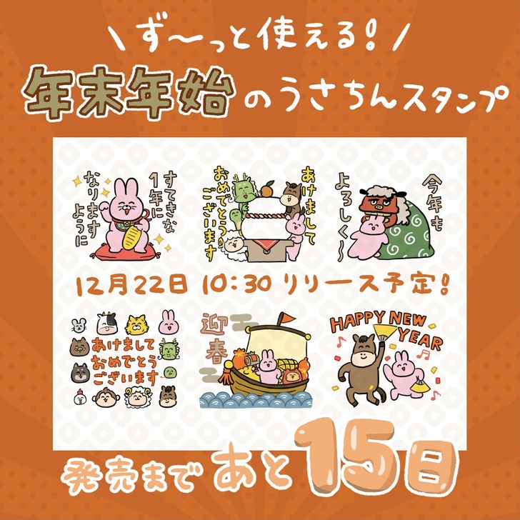 うさちんスタンプ発売まであと1日! 2025年12月21日 うさちんスタンプ発売まであと1日! 発売まで、ちょっとずつスタンプとラフ画像を紹介していきます。 今回は、年末に大活躍するスタンプを6個持ってきました。 新年用のスタンプは十二支いて、 敬語・タメ口あるのでず〜っと使えます! いよいよ明日発売です!ぜ ... 続きを読む